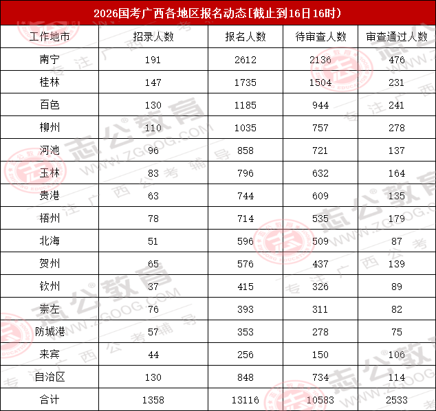 截止到16日16時,2026國考廣西地區(qū)各地市報名人數(shù)最多的地市為南寧、桂林、百色,其中南寧報名人數(shù)為2612人,位居第一!整體報考人數(shù)達(dá)13116人!對此,小志建議大家,報考崗位時需將自身職業(yè)愿景與個人實際條件(如專業(yè)、學(xué)歷、基層經(jīng)驗等)緊密結(jié)合,理性分析崗位競爭情況,最終做出最適合自己的選擇。