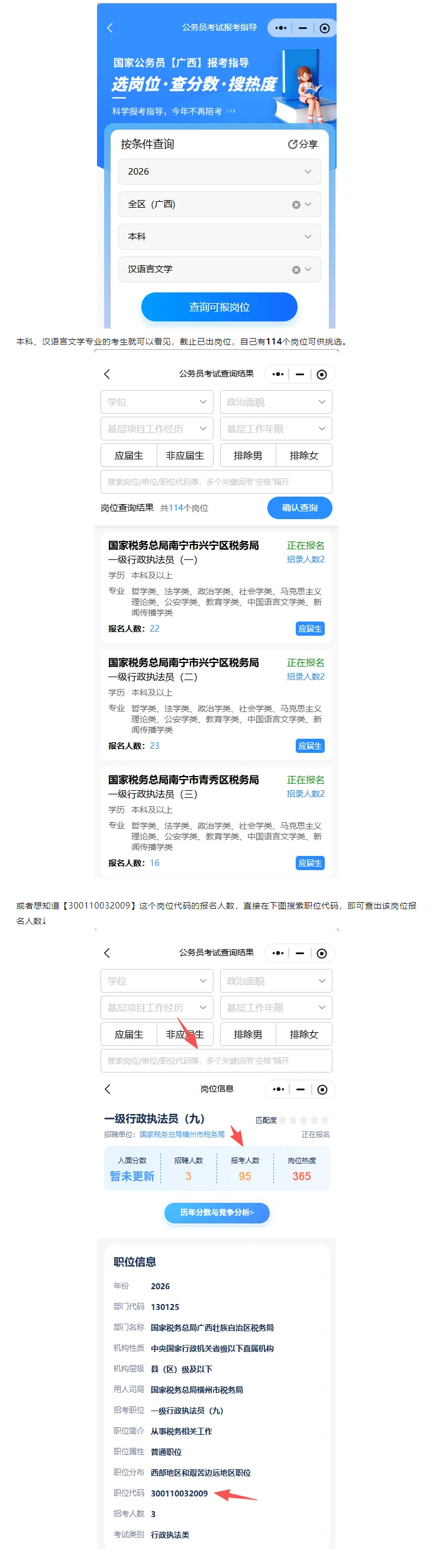 因為是處于國考選崗階段,我們更想知道選崗功能,思路是【選擇學(xué)歷】-【選擇專業(yè)】/輸入崗位代碼即可看見想查看的崗位,自己查看可以報名的大致崗位范圍及具體崗位的報名人數(shù),下面以2026年國考(廣西)崗位為例,比如,你是本科、漢語言文學(xué)專業(yè)的考生,選擇學(xué)歷-【本科】輸入【漢語言文學(xué)】選擇彈出來的分類目錄。